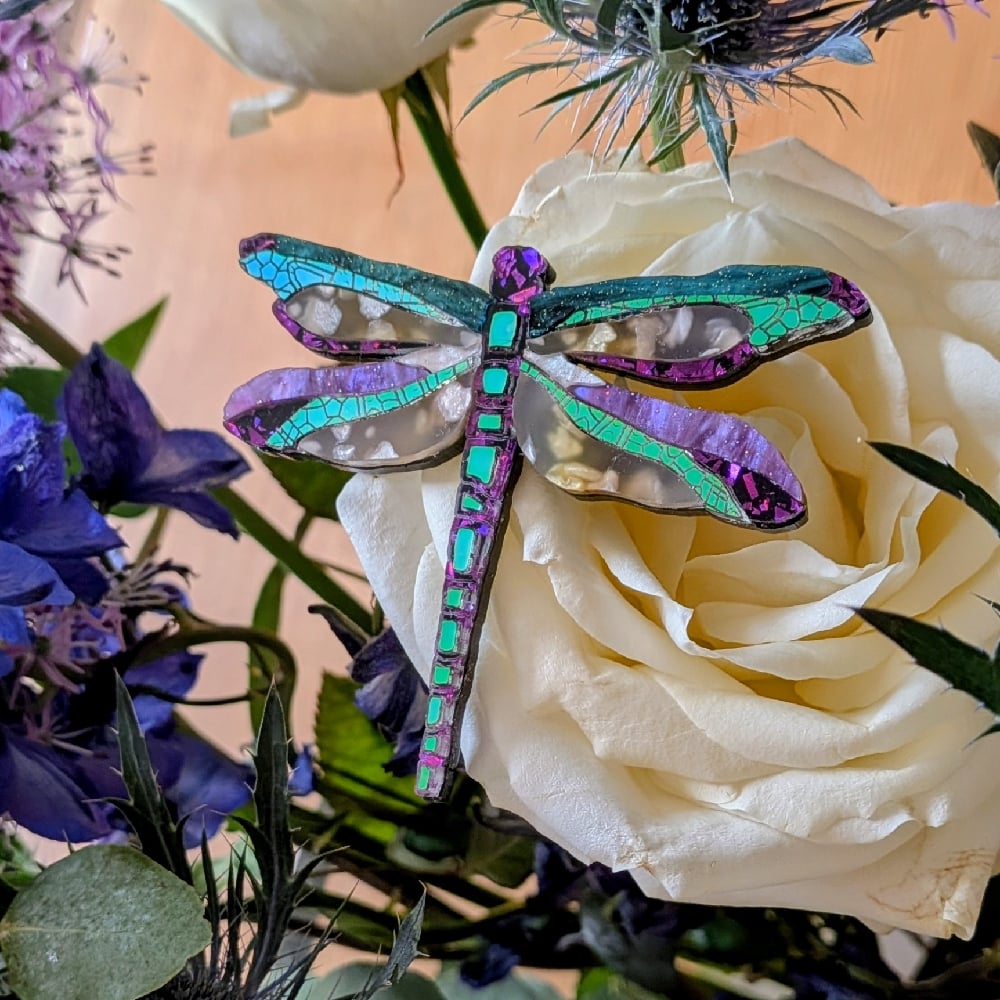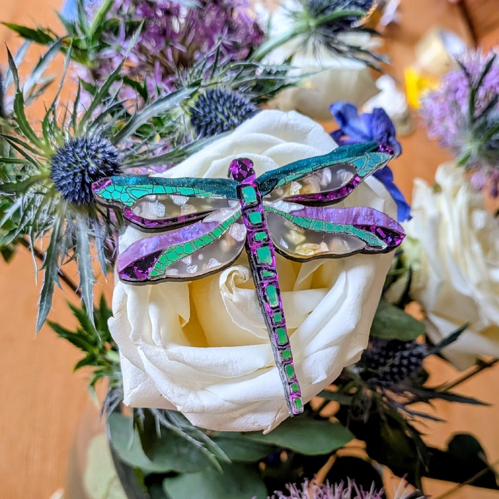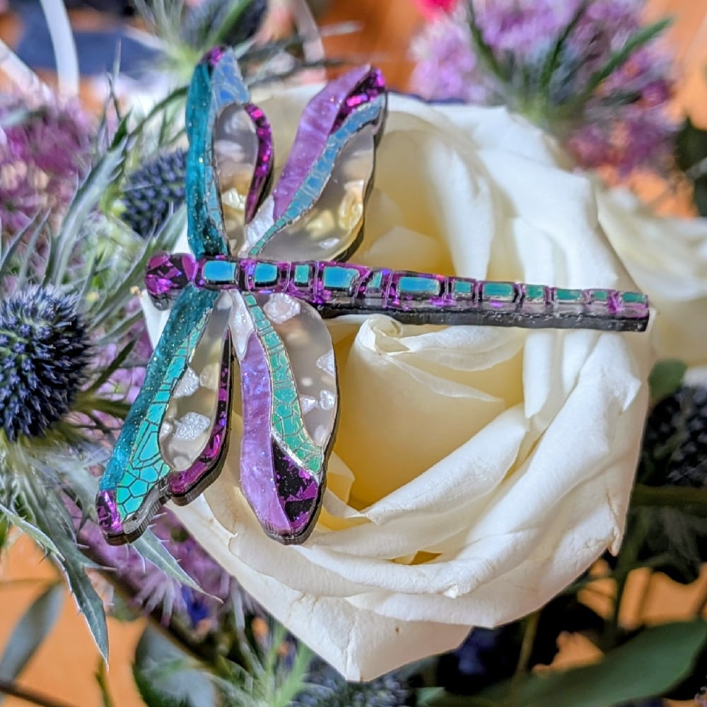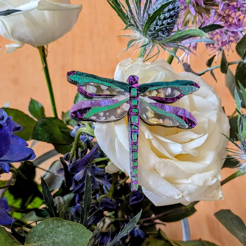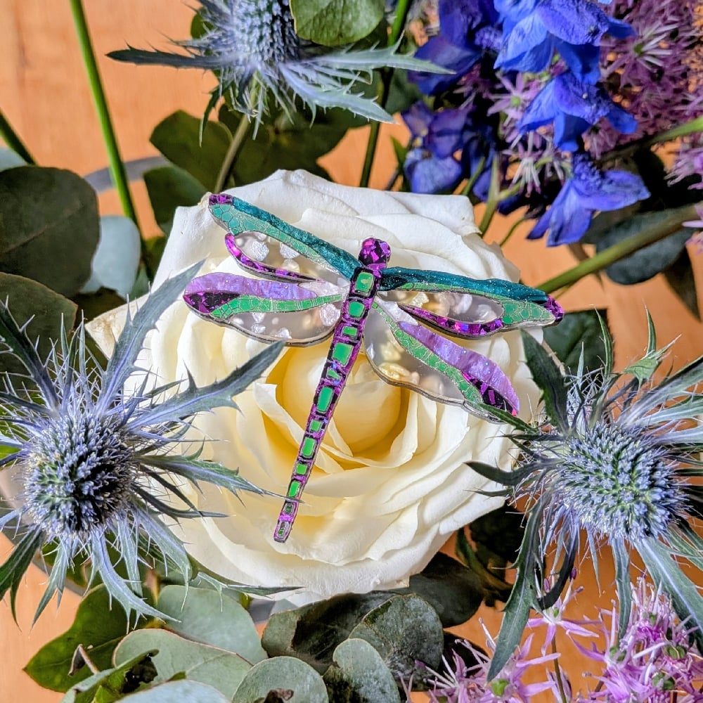 This piece differs significantly to the others in that it has a unique acrylic for the main wings. Beautiful pearly pieces are suspended in an opaque base giving a hint of bullrush riverside colours. The colourful ripple wings have a light smattering of a fine glitter throughout. The very nature of the acrylic, where it is cut and in which direction ensures that each dragonfly is absolutely unique. An unusual classy piece.