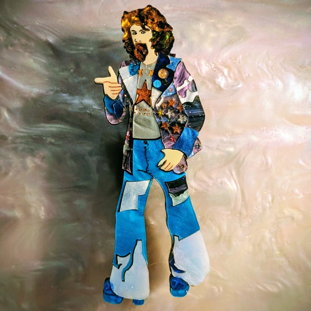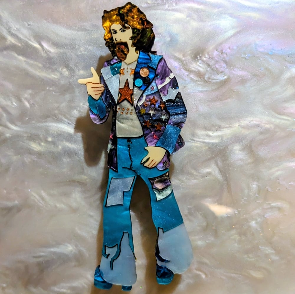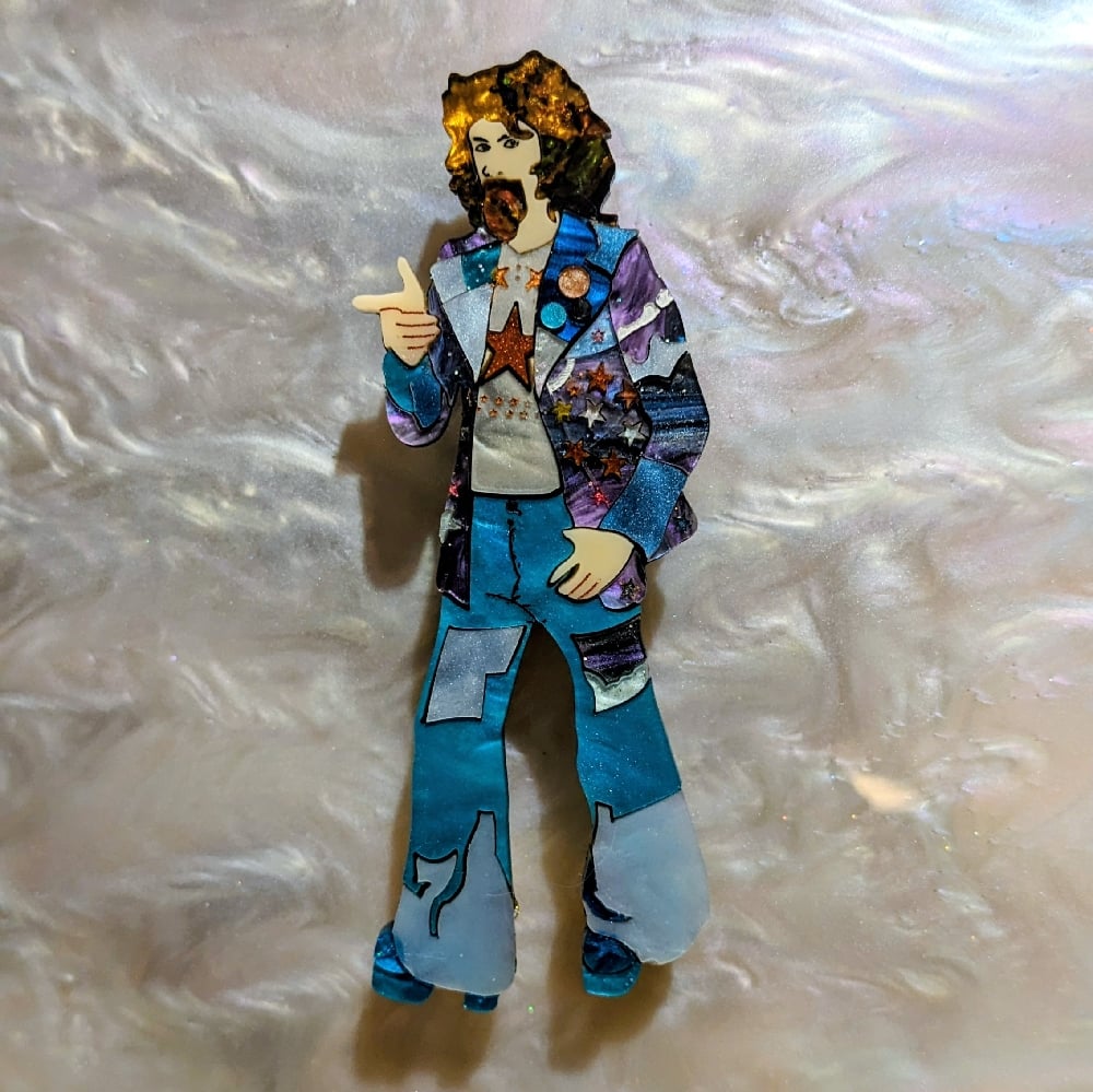 This brooch is crafted from striking, denim-like acrylics — a perfect nod to the era when denim-on-denim was a thing! The moment I saw the colour of the acetate, I knew it was destined for those windswept and interesting locks.