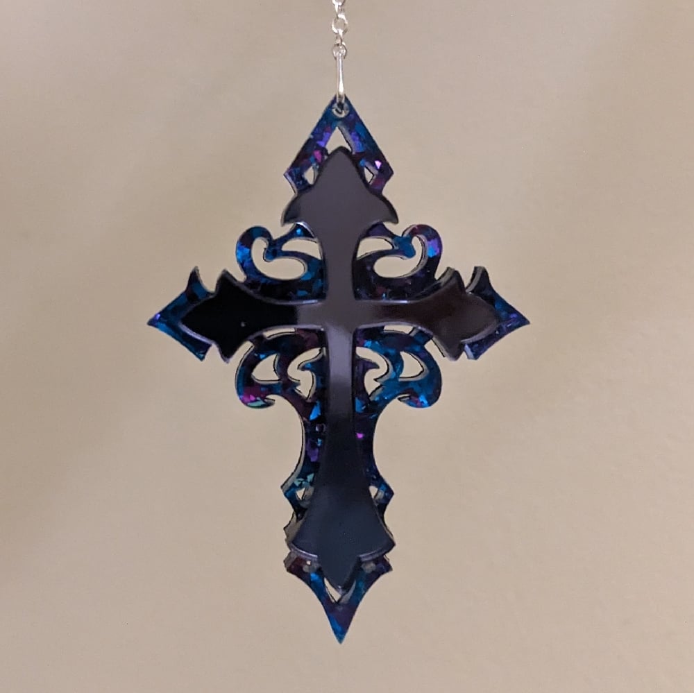 A gunmetal mirrored acrylic sits upon a deep purple foil acrylic with flecked highlights of blue and pink that catch the light.