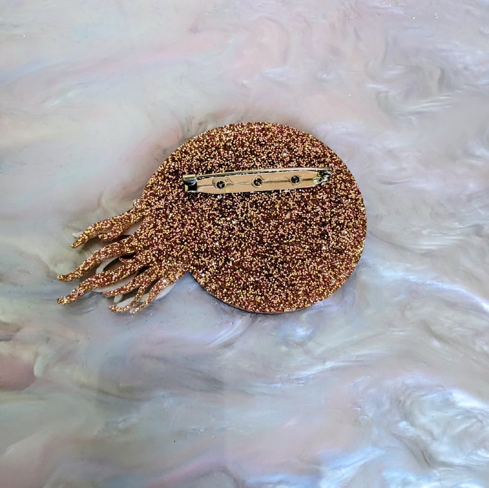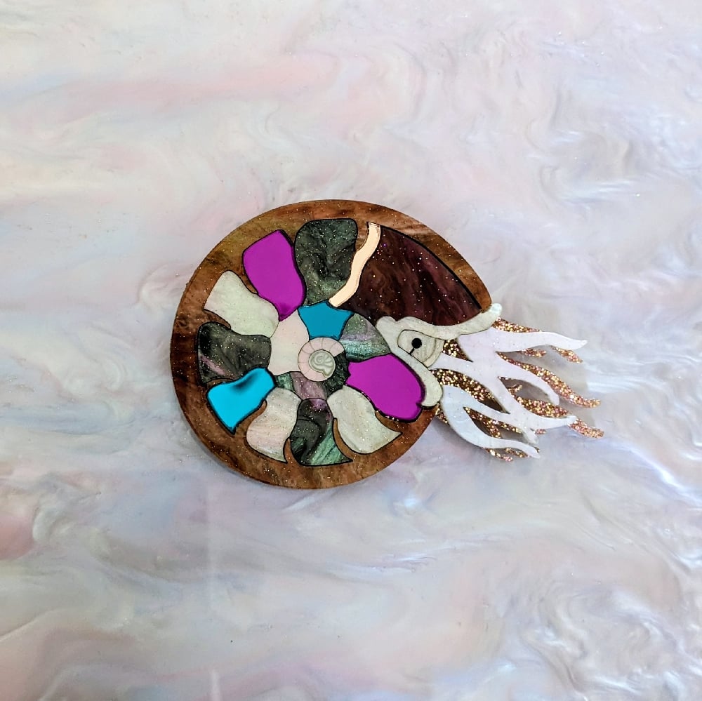 This sophisticated brooch is beautifully designed to depict the inner workings of these exceptional creatures of the deep. It is made from a lovely mix of acrylics that work beautifully together.