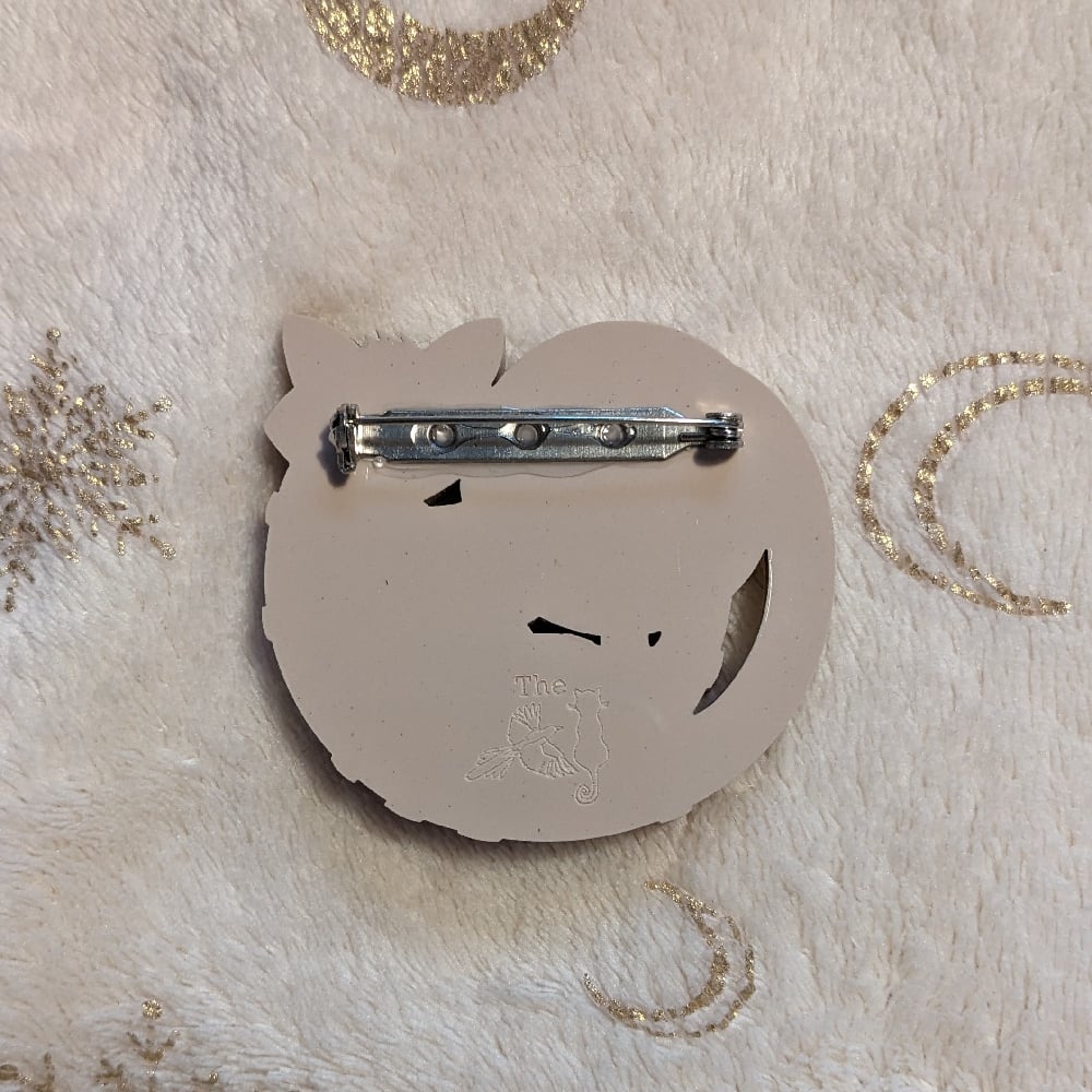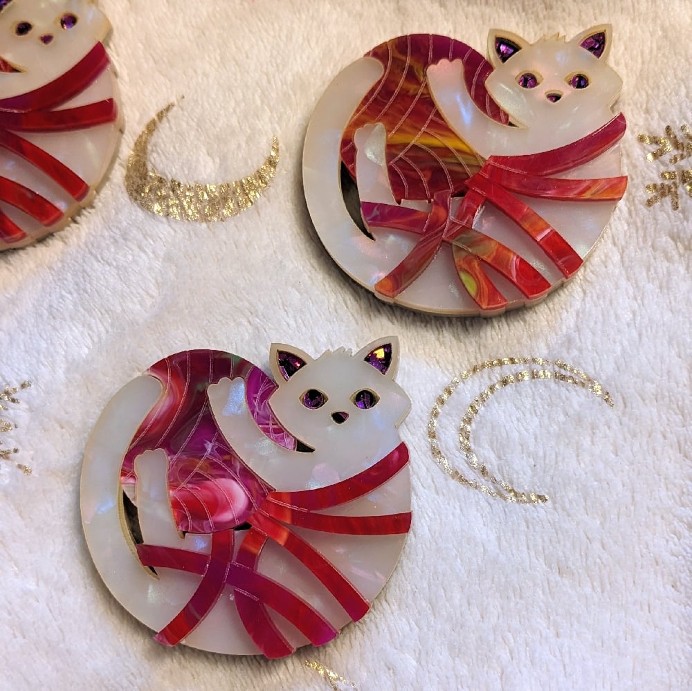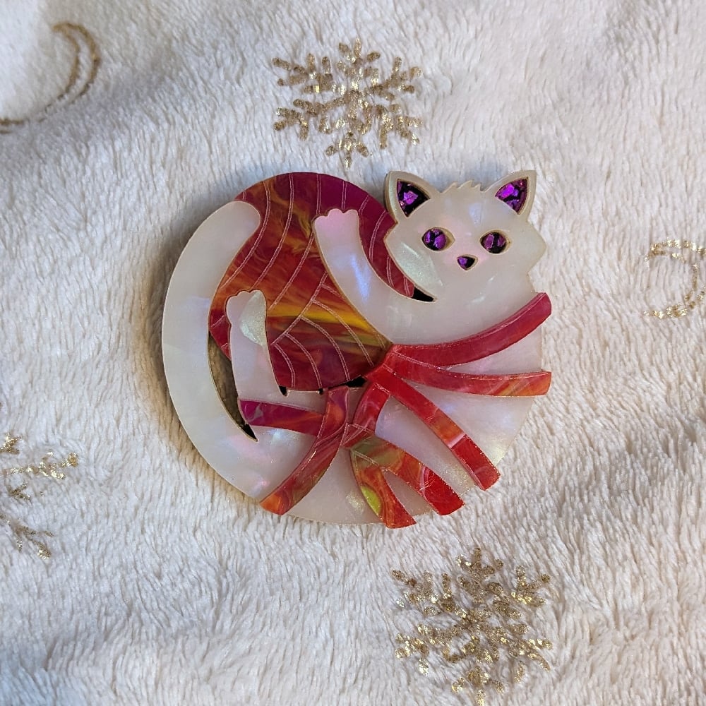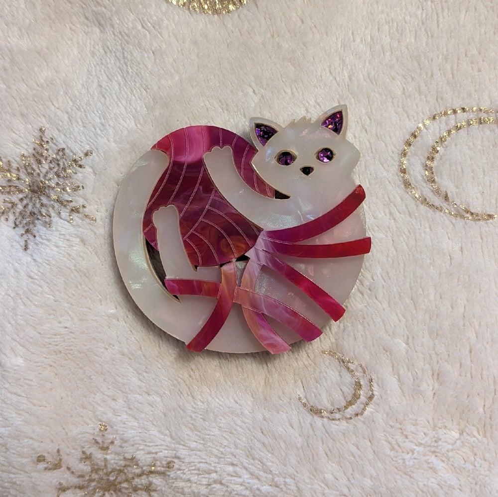 Snowball; made from a gorgeous opal-like acrylic that shimmers hidden depths on closer inspection, has purple/pink/black dappled eyes, ears and nose. The ball of wool unravels an array of different colours and encapsulates, not only Snowball but the fun of this piece. Super cute.